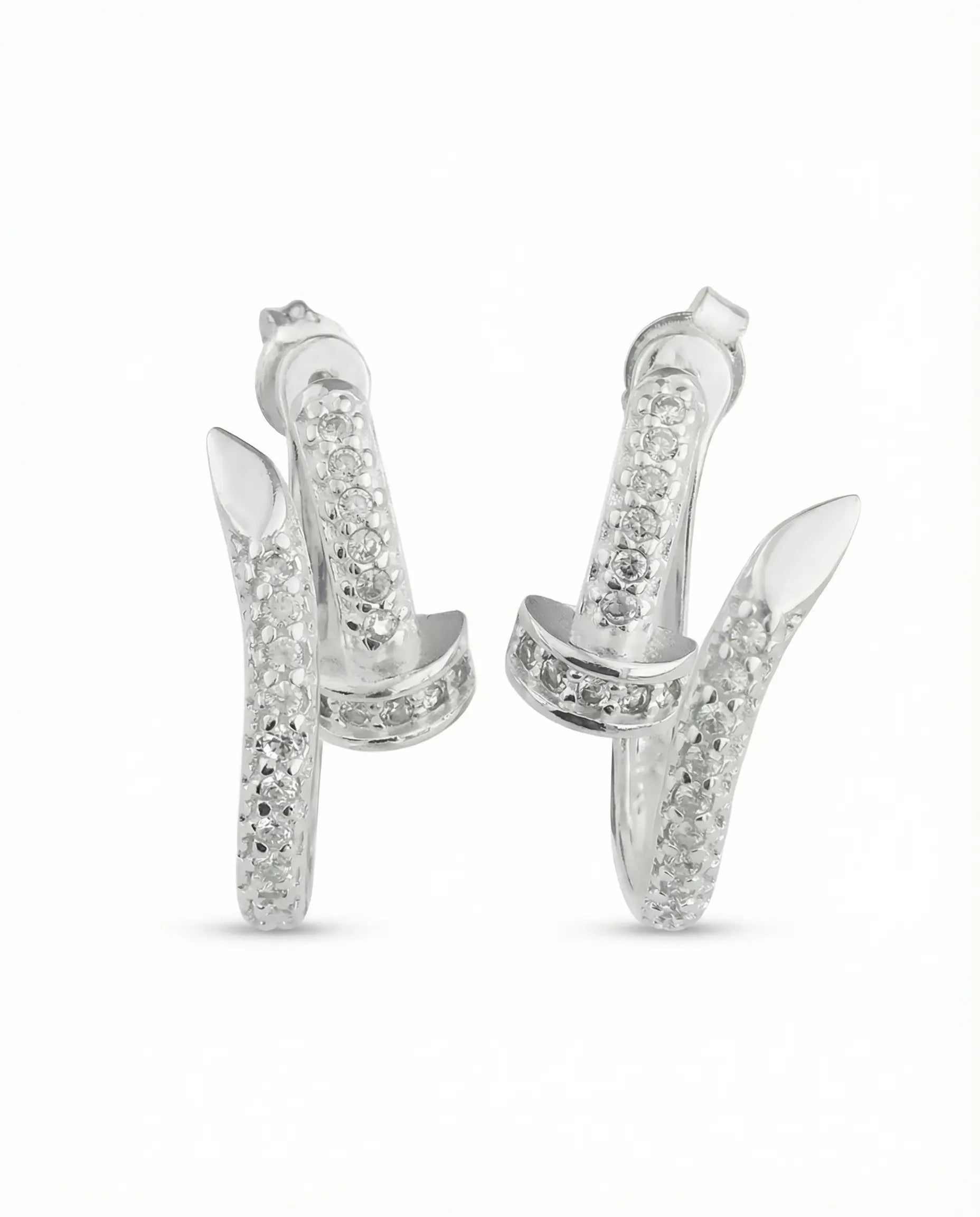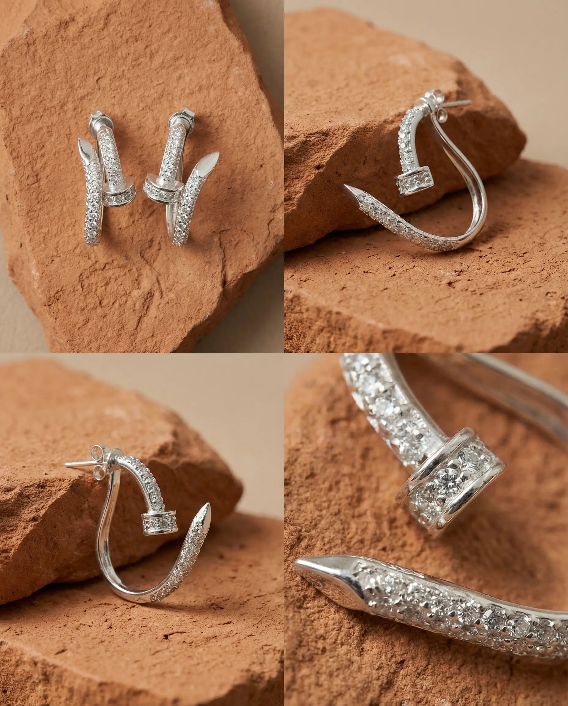 Les Boucles d’oreilles Orée se portent comme deux clous de lumière plantés au creux du lobe, une base pavée de zirconium, prolongée par une tige qui remonte légèrement le long de l’oreille. À chaque mouvement, la ligne d’argent scintille et dessine un trait net, comme une décision assumée qui encadre votre visage. Façonnées à São Paulo, elles transforment le symbole brut du clou en talisman raffiné, pour celles qui avancent droit, mais jamais sans douceur.