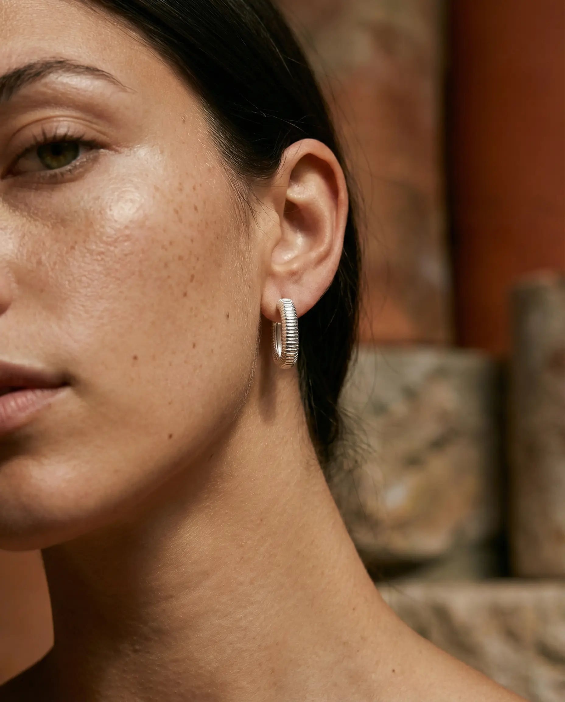 Les Boucles d'oreilles Ria en argent 925 se distinguent par leur texture striée unique qui leur confère un relief et une brillance exceptionnels. Robustes et légères grâce à leur conception tubulaire, elles sont confortables à porter toute la journée sans tirer sur le lobe. Hypoallergéniques et garanties sans nickel, elles respectent les peaux les plus sensibles. Ces créoles modernes sont une idée cadeau parfaite pour une femme active et élégante, cherchant des bijoux durables qui traversent les tendances avec caractère.