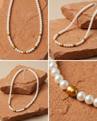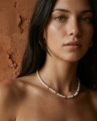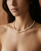 Le Collier Diva dessine autour du cou une ligne de douceur lactée, ponctuée d'éclats dorés qui réchauffent la peau. Les perles nacrées captent la lumière ambiante pour la diffuser en un halo subtil, tandis que les touches d'or rythment le collier comme des notes de soleil. Façonné à São Paulo, il se porte comme un fil de lumière intemporel, pour celle qui cherche à allier la pureté du blanc à la chaleur de Bahia.
