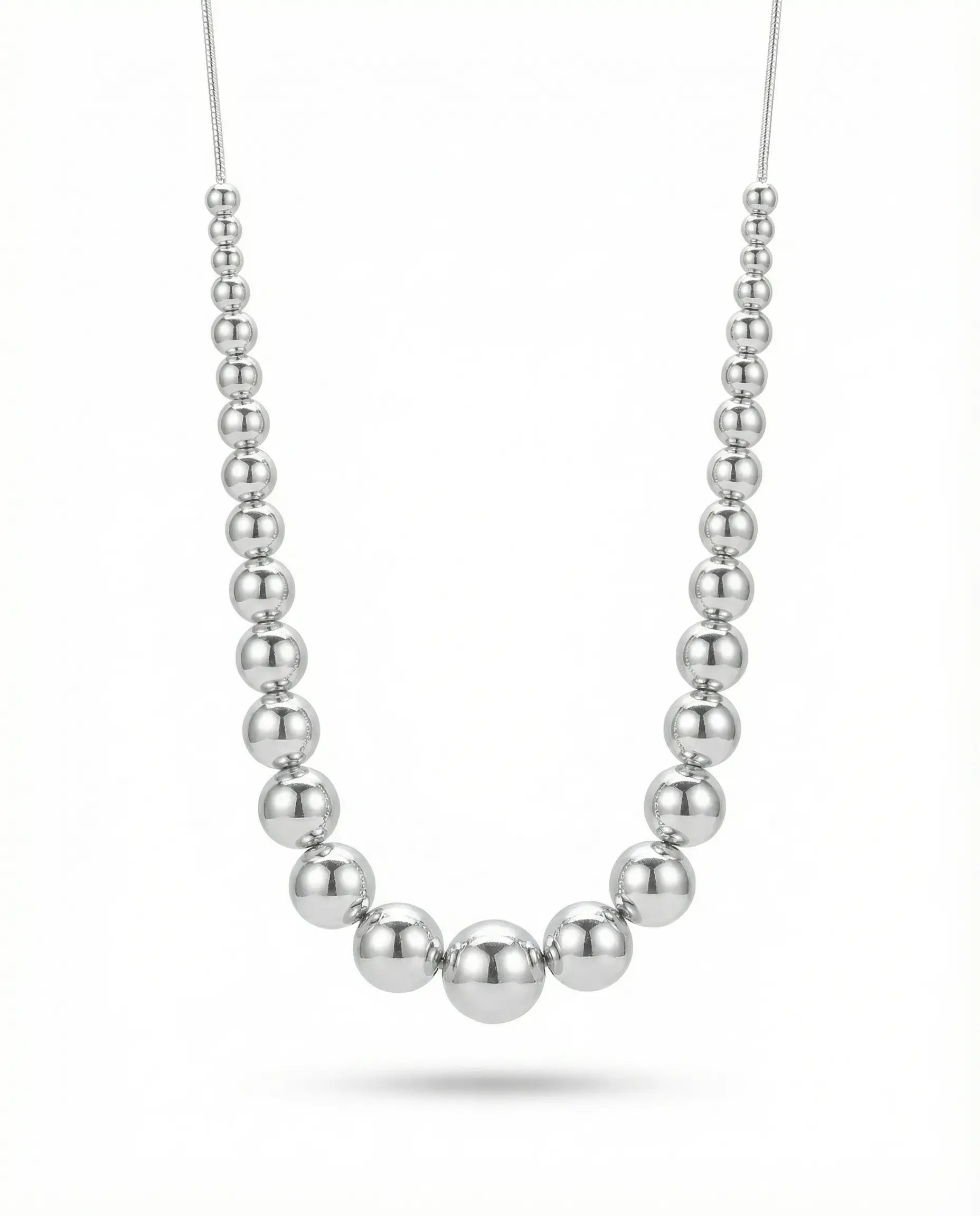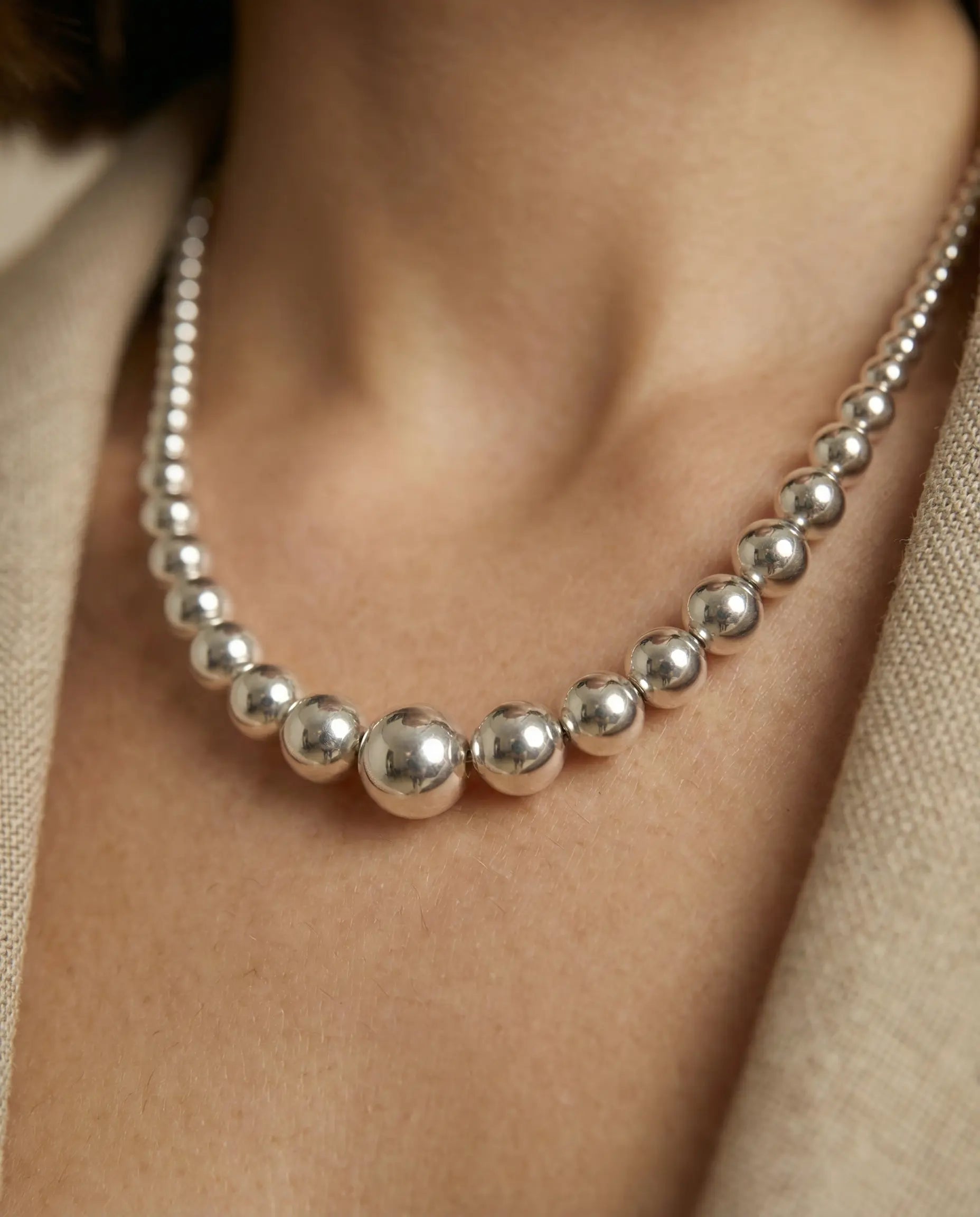 Le Collier Sol dépose sur la clavicule une constellation de petites boules d'argent lisse, qui roulent doucement contre la peau à chaque mouvement. Les sphères de tailles variées accrochent la lumière par touches inégales, comme des gouttes de soleil capturées le long d'un fil argenté. Travaillé dans un atelier joaillier européen, il incarne cette géométrie douce qui accompagne vos journées sans imposer un style, juste une présence lumineuse.