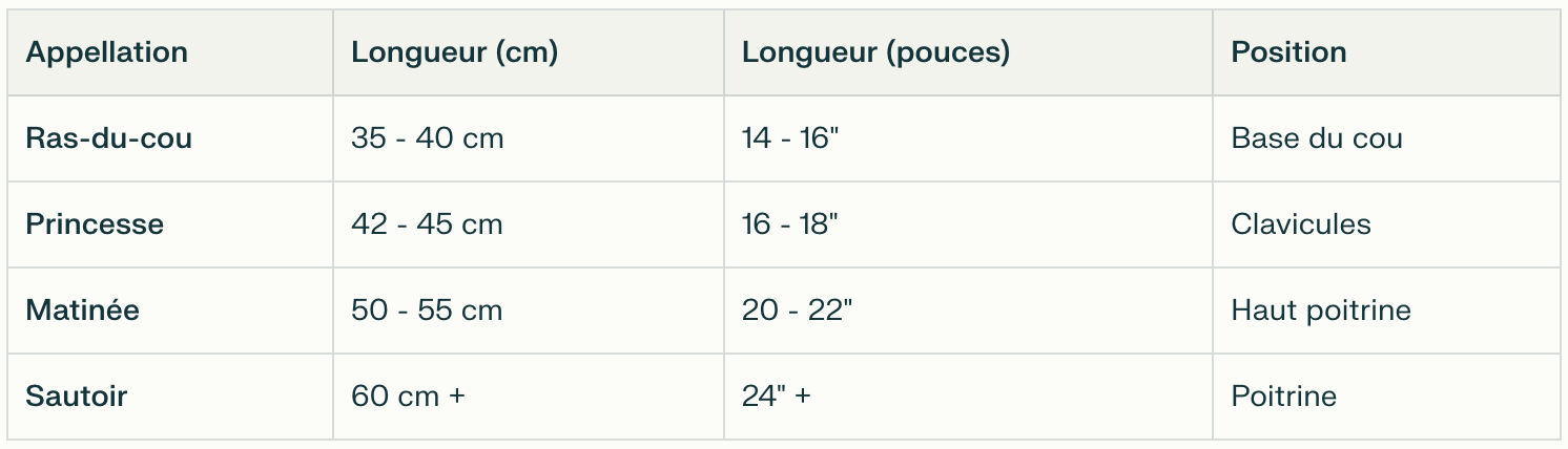 Dans l'univers de la bijouterie, chaque longueur correspond à un style précis et à une position sur le buste.