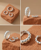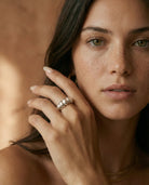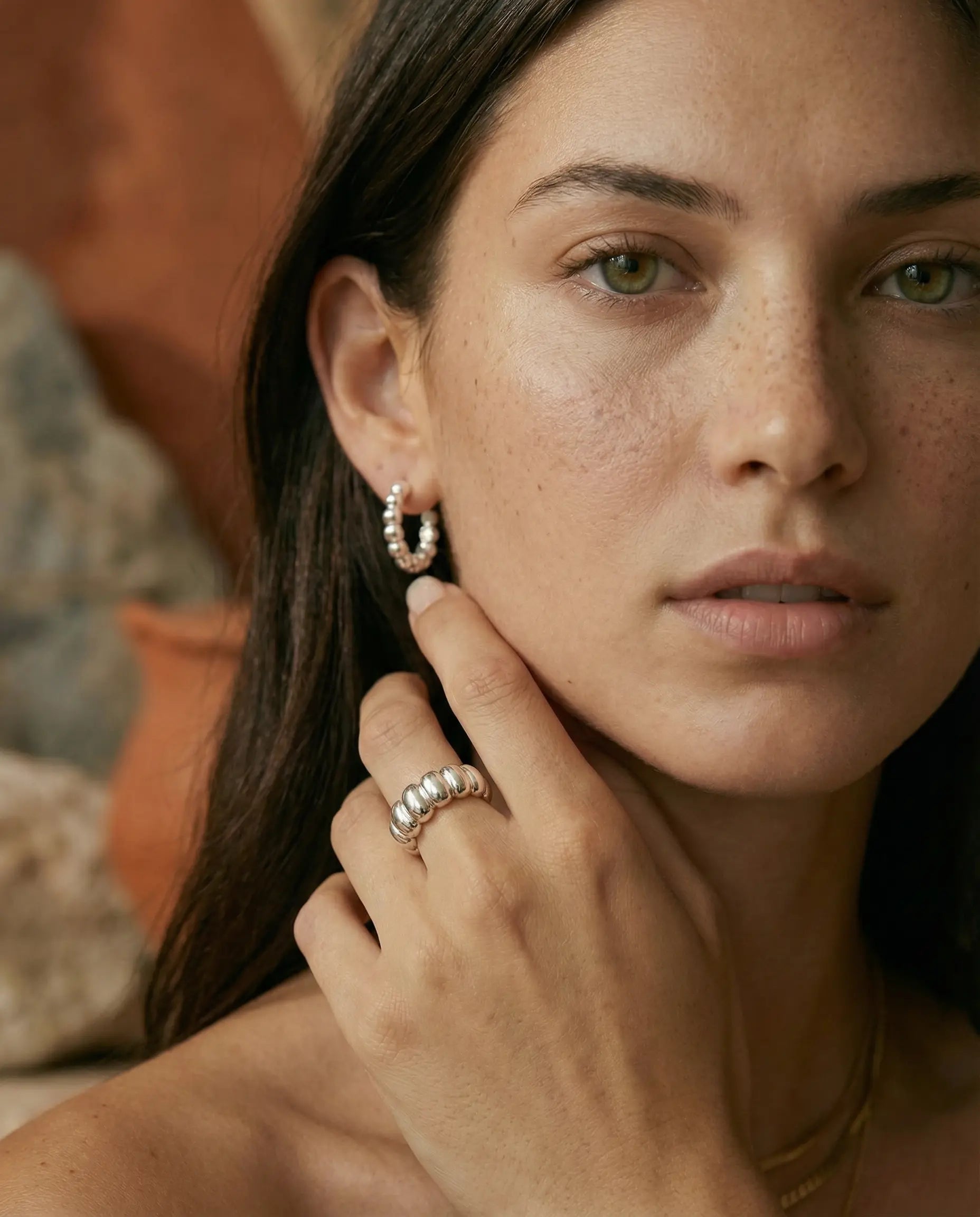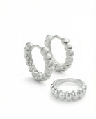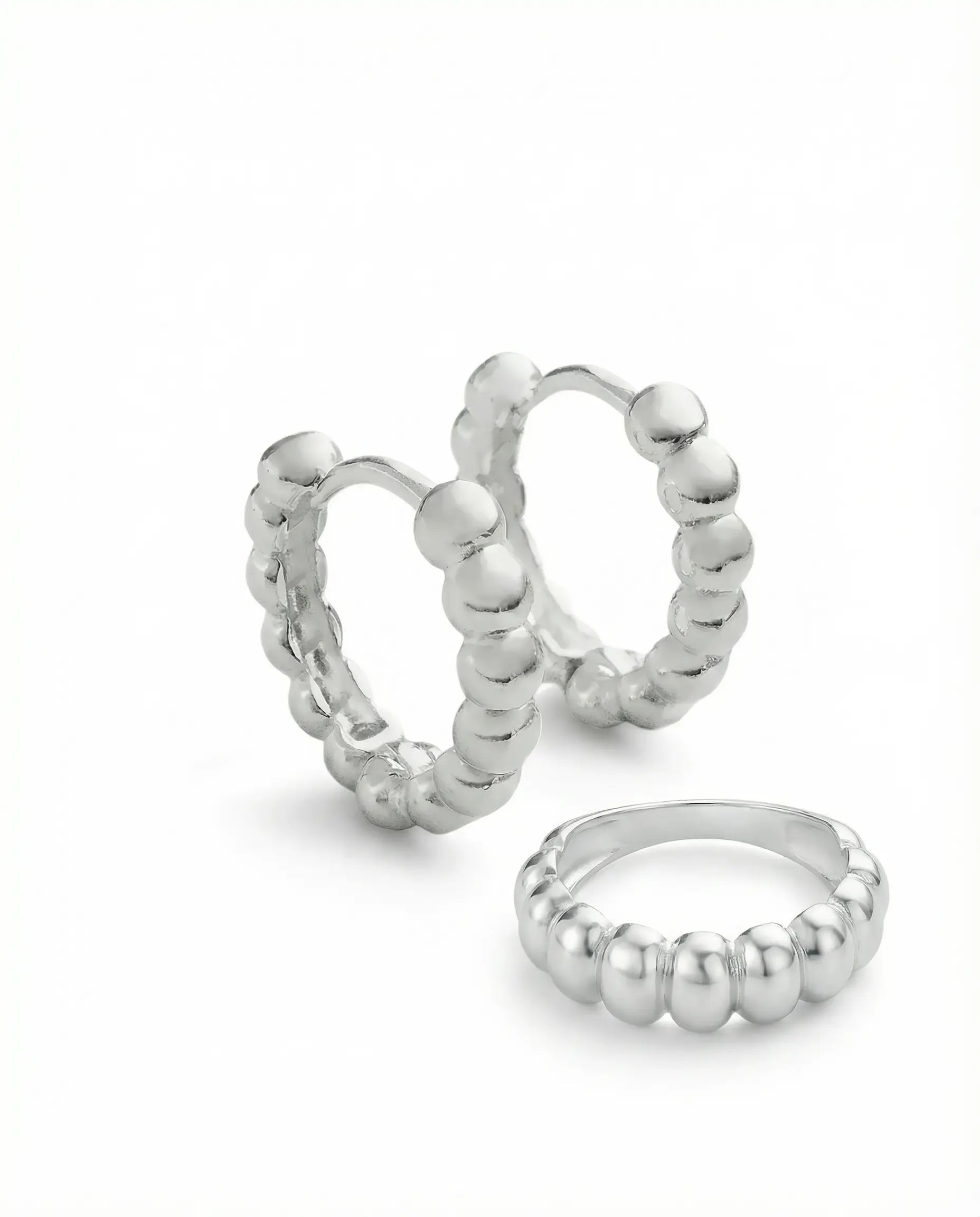 Dimensions : Bague Joy, anneau ondulé de largeur moyenne, confortable en port quotidien. Boucles Joy, petites boucles proches du lobe, hauteur env. 10–12 mm, ligne ondulée légère